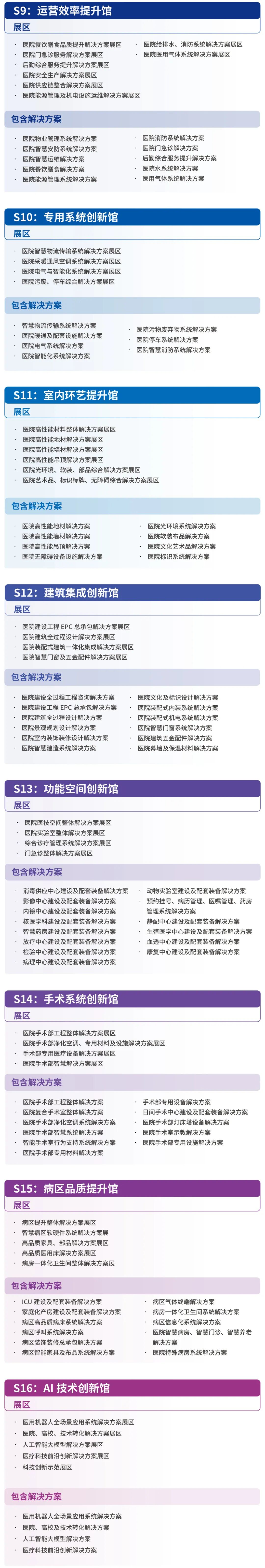 大会设置40大核心展区,完整覆盖医院规划设计、机电系统、装饰装修、医用专项、医疗设备、医用机器人、智慧医院、后勤运维等医院建设采购全流程,各展区逻辑连贯、内容互补,真正实现从项目启动到运营维护的全景呈现,助力医院建设者高效完成从概念到落地的全流程决策与资源对接。